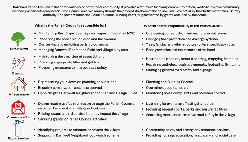 Parish and town councils are part of local government in Northamptonshire together with the North Northamptonshire Council. Each is responsible for different things.